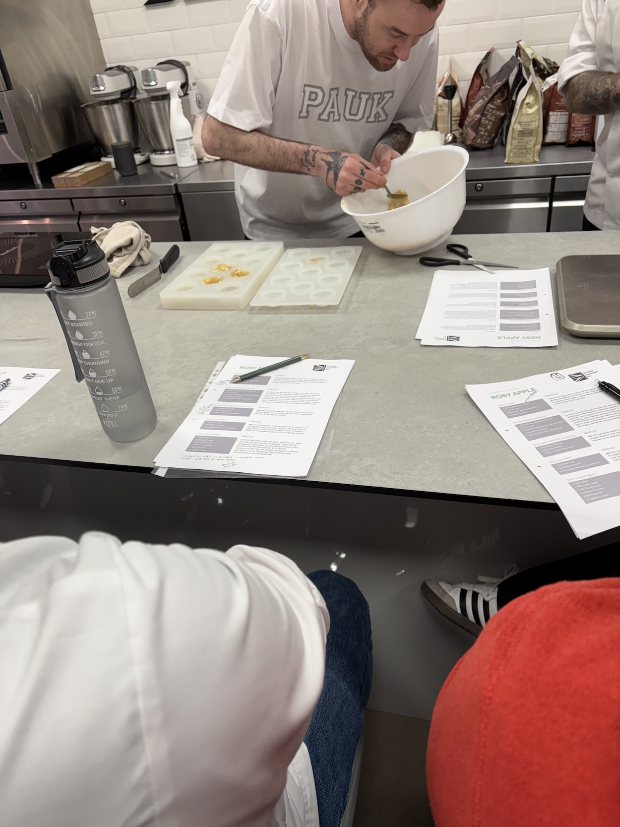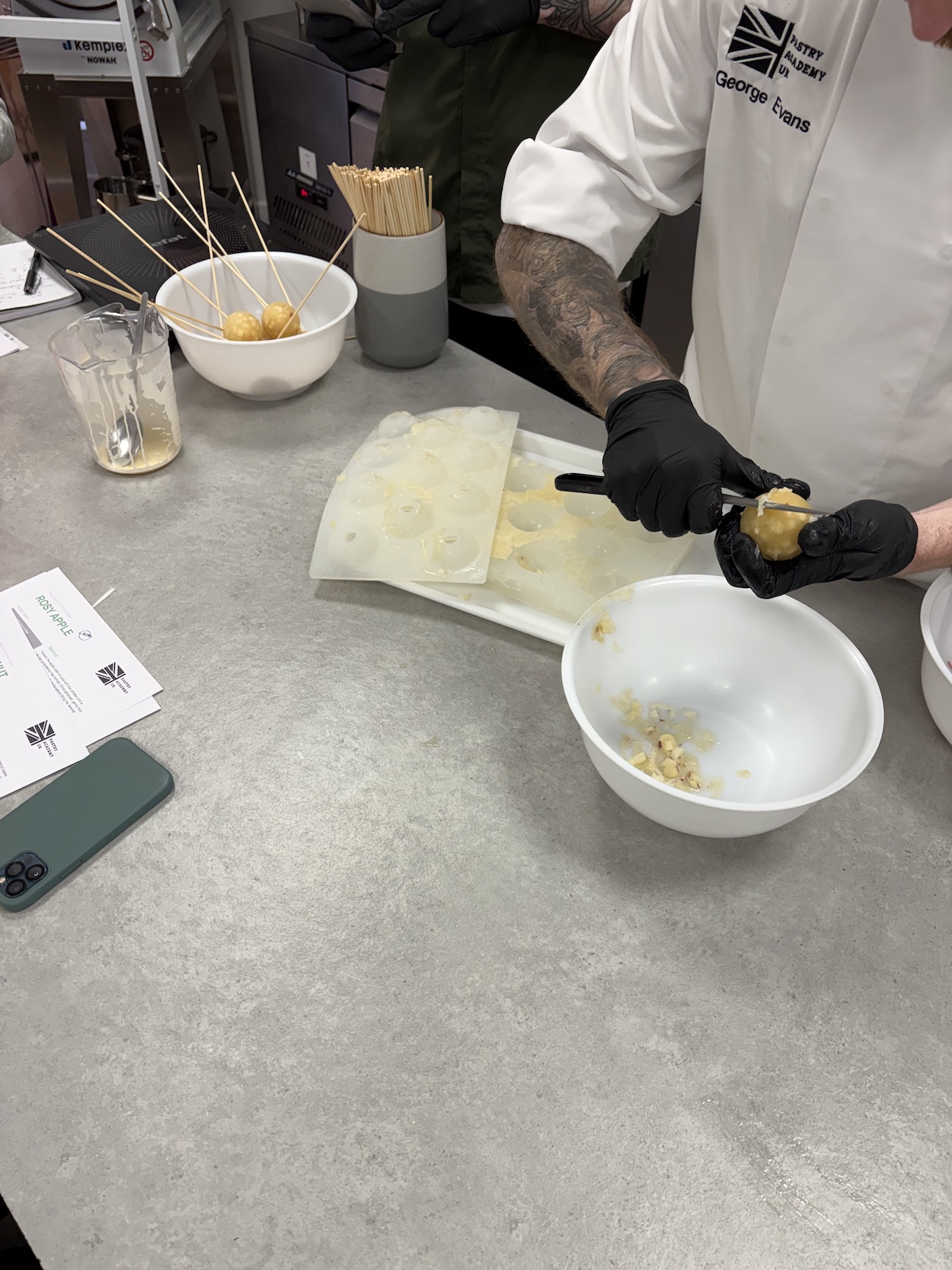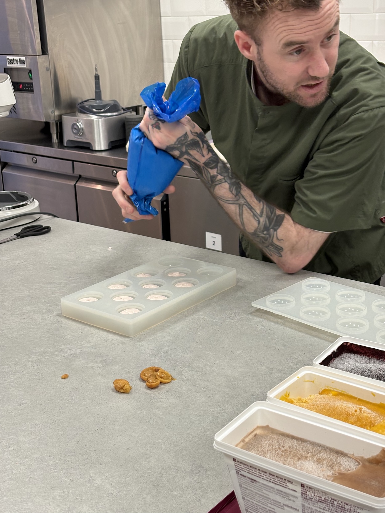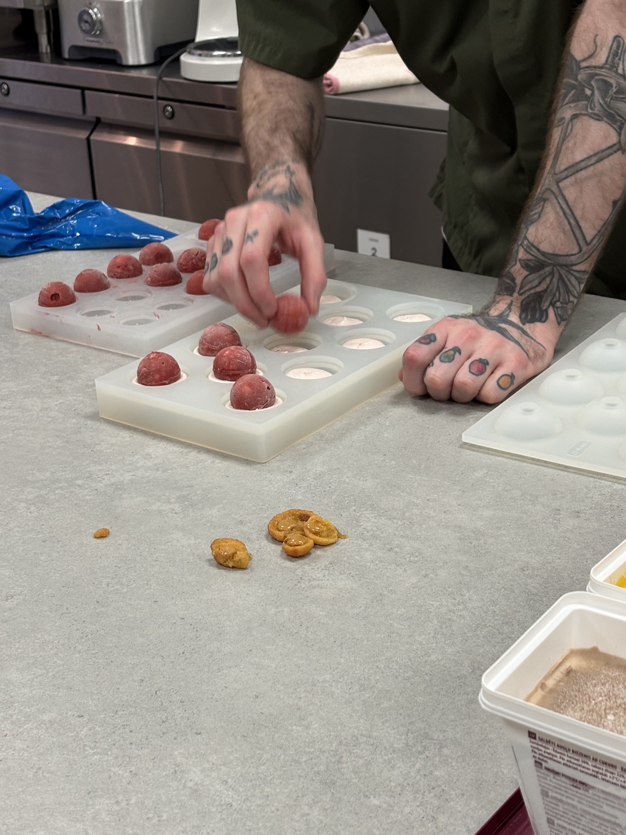 Most of the components are all in the fridge or freezer to fully set and assemble tomorrow. We did place the strawberry inserts in a larger spherical mold after piping in some of the whipped ganache and then added the top of the mold to pipe the rest of the ganache and create the full sphere. This was then placed in the freezer to set for tomorrows final chocolate shell and glaze. We also inserted skewers into the apple inserts and placed those in the freezer to crystalize more.