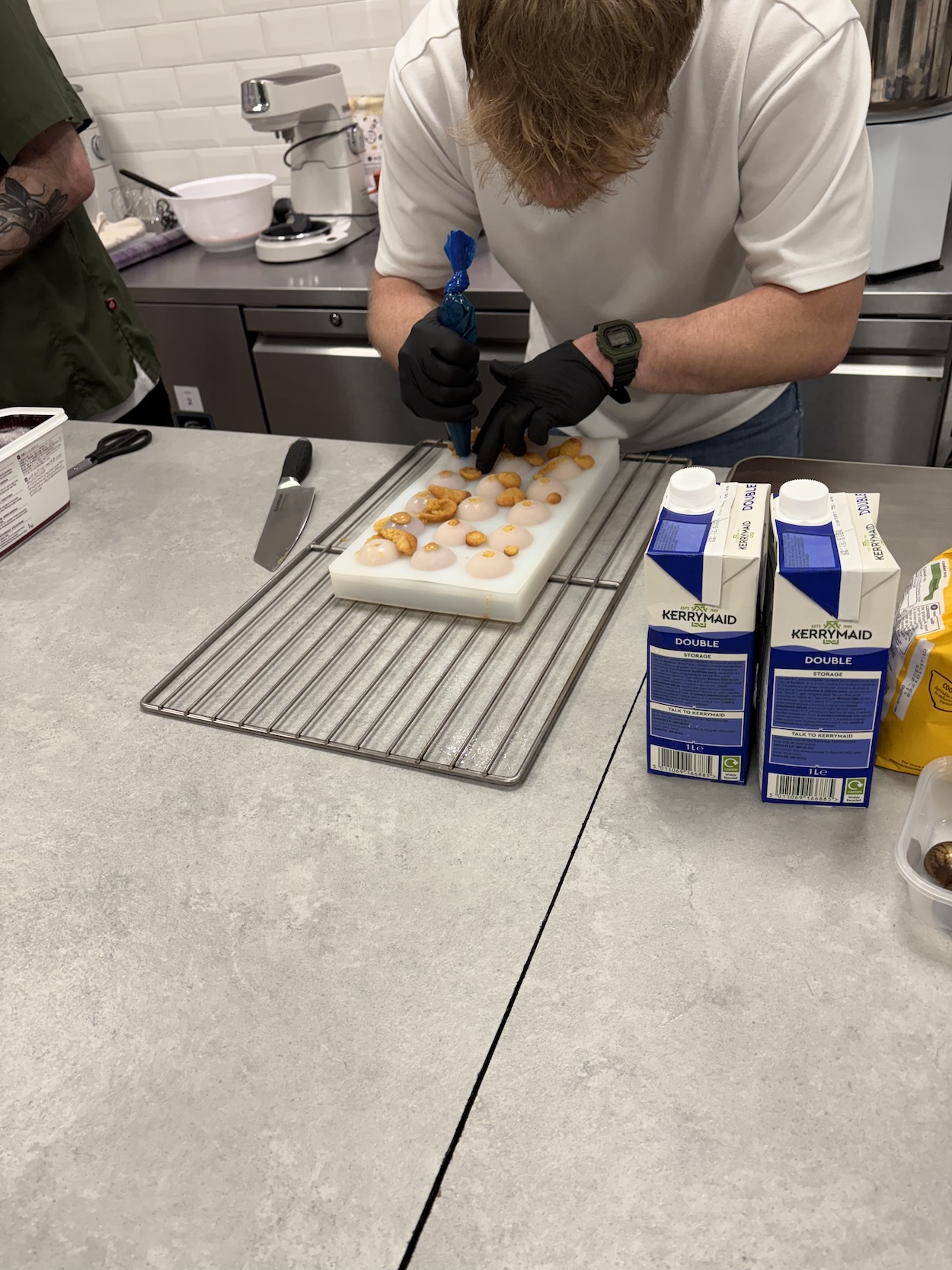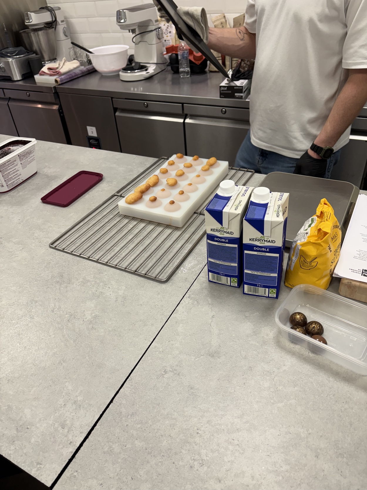 We then worked on the hazelnut which is slightly different as instead of a gelatin based insert we created a hazelnut sponge. We baked the sponge in a spherical mold and then when we took them out of the oven we piped in some extra hazelnut praline to give it more hazelnut flavor. We then put this in the fridge to set and created a hazelnut whipped ganche for the outside.