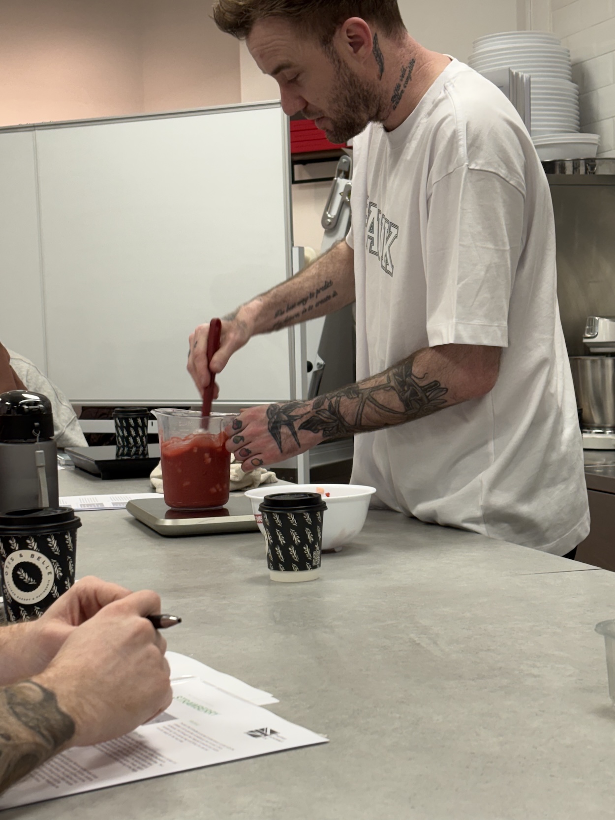 We started with the strawberry and apple inserts, using fresh fruit and fruit puree as well as gelatin to thicken the insert. We then piped these in spherical molds and put them in the blast chiller to freeze. After this we worked on the whipped ganache to set as the outer layer to the inserts. Sometimes in shops they may use a mousse instead of a white chocolate ganache however Damien has found that the ganache holds the fruit shape better and lasts longer in the fridge.