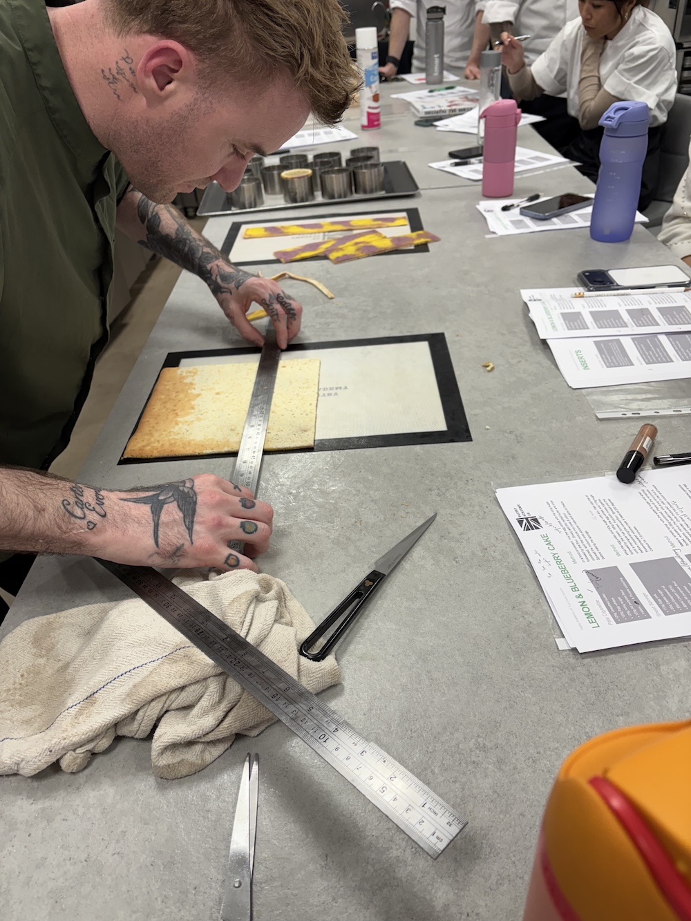 We froze the twill batter very thin on a sheet pan and then made a light sponge to spread on top of the twill, we froze the twill so that it does not mix in with the sponge. To spread the sponge evenly we used acrylic strips to create an even height and spread. We baked this very quickly and then flipped it onto some parchment and peeled the silicon mat off to let the steam rise out. While this cooled we got the rings ready with acetate around the inside to easily remove the cake insert later on.