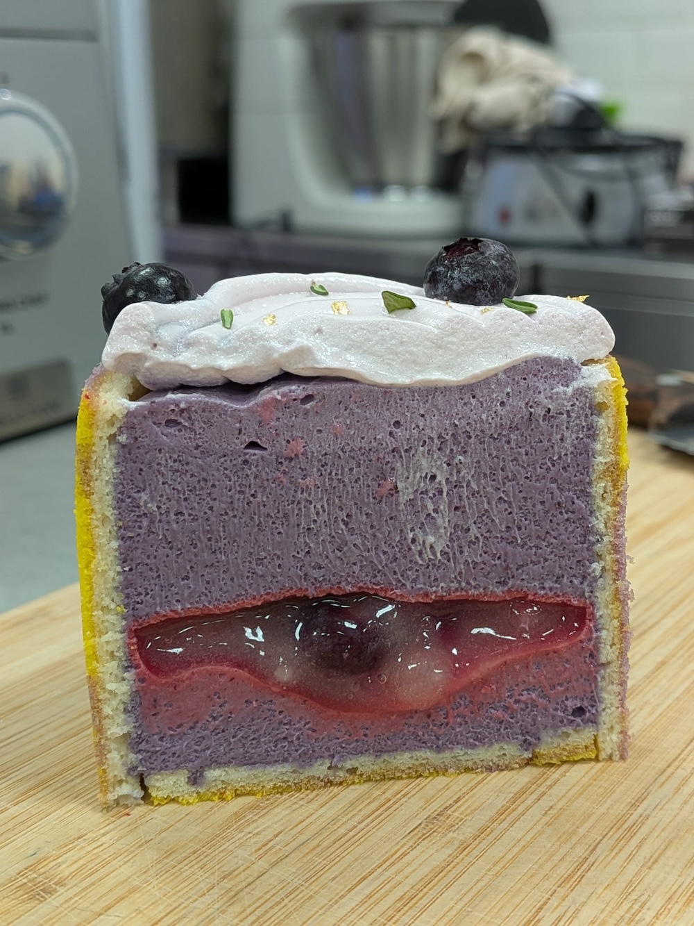 Lastly we created an Italian meringue with a bit of purple in it, this was then swirled on top of the cakes. We used a fancy spinner to get the swirl even on the top of the cakes and then decorated with gold leaf, thyme, and frozen blueberries.