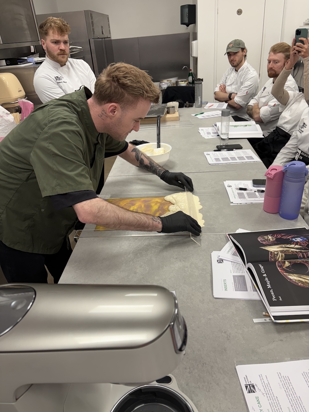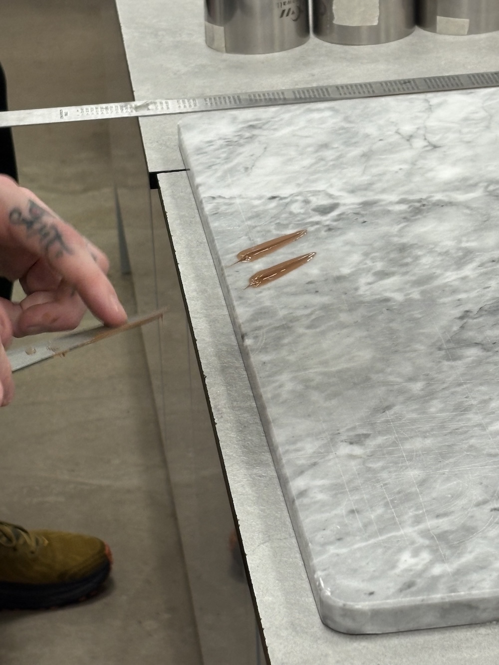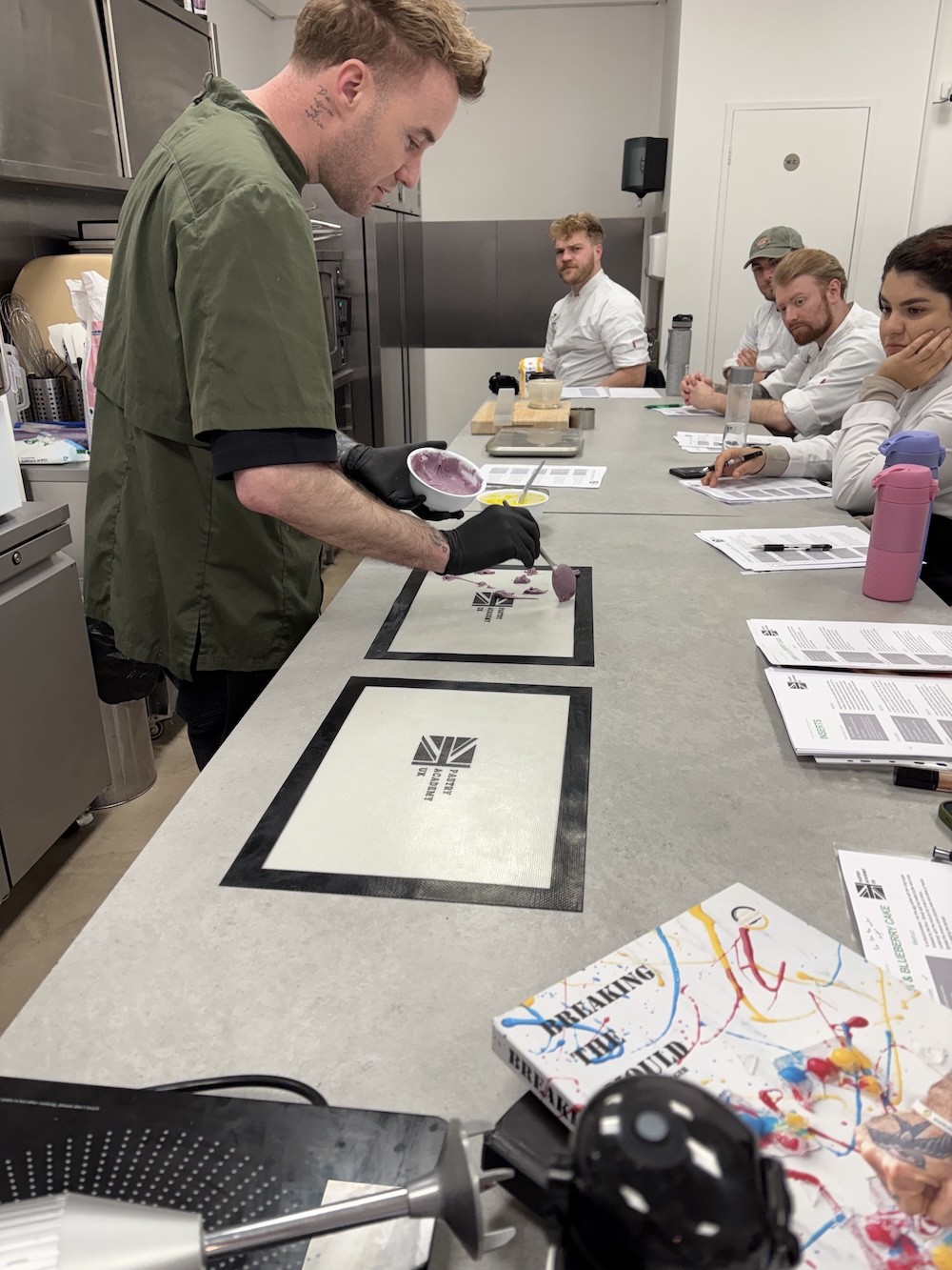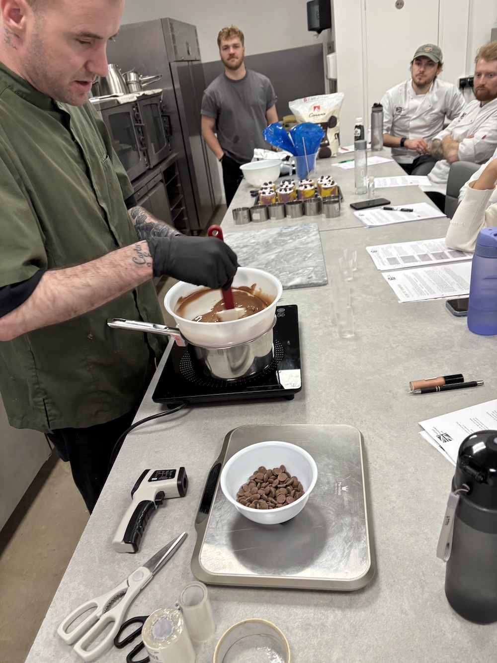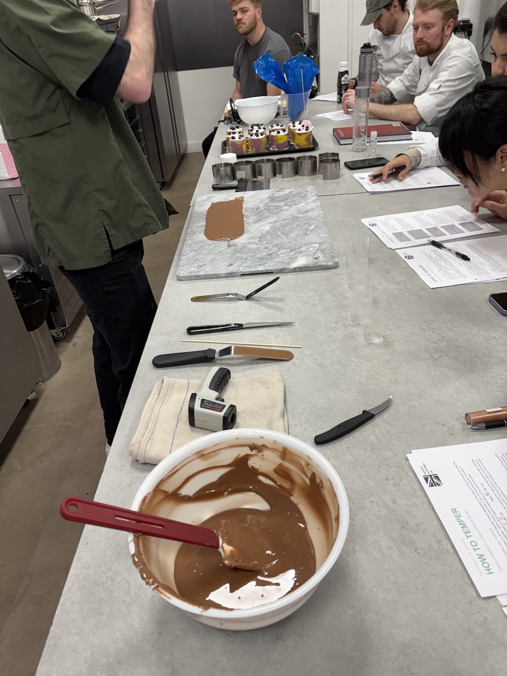 As a little lesson for tomorrow we tempered some chocolate to make some fancy rings and feathers. Damien taught us how to temper chocolate without a fancy temper machine and without cocoa butter, just melting the chocolate to a higher temperature such as 50 degrees Celsius for milk chocolate. Once the chocolate was melted to temperature 1/3 of the original weight was added in new unmelted chocolate to temper and cool the chocolate. The chocolate is at a useable temperature at 29 degrees celsius and can then be used to make chocolate garnishes.