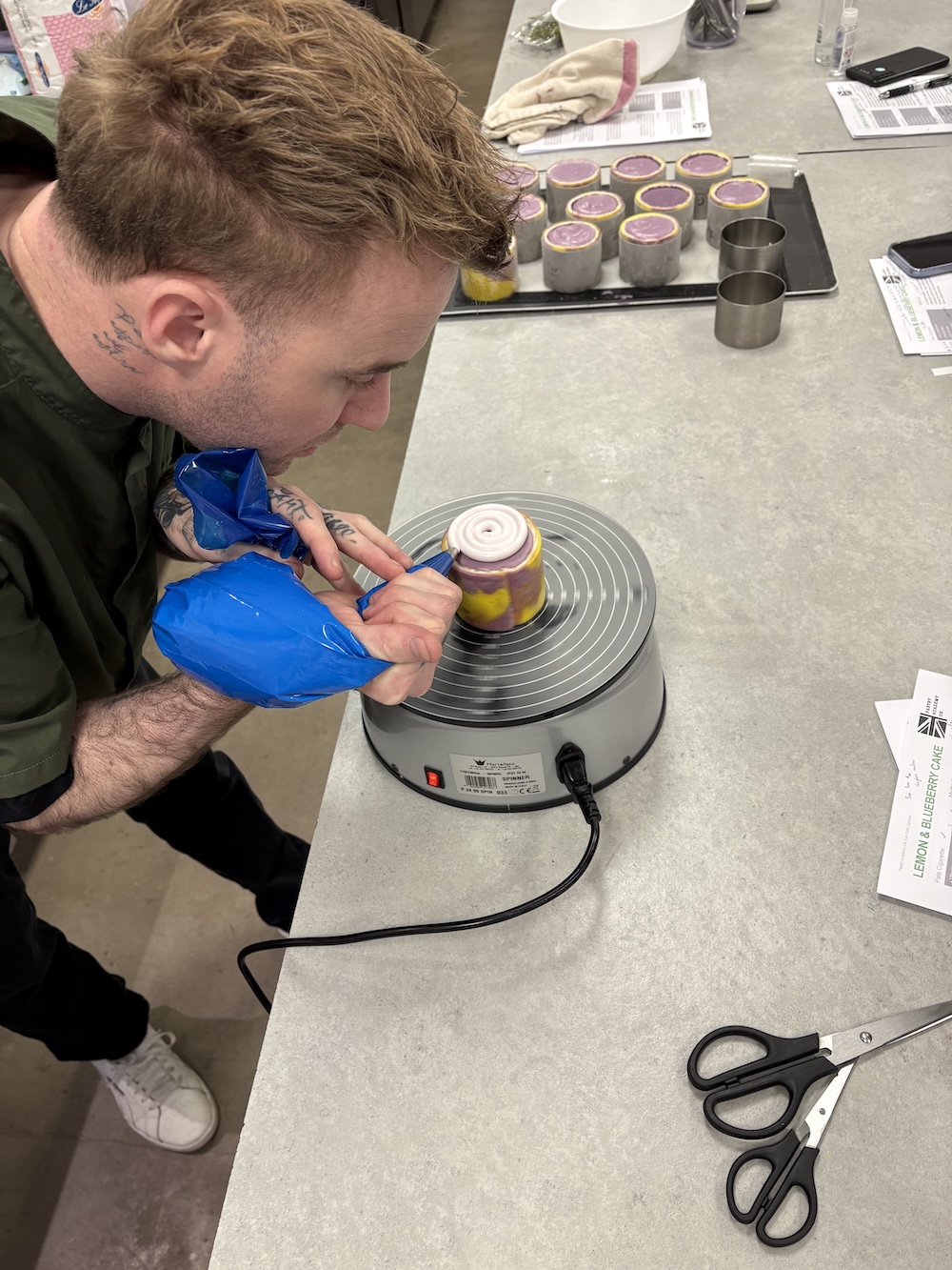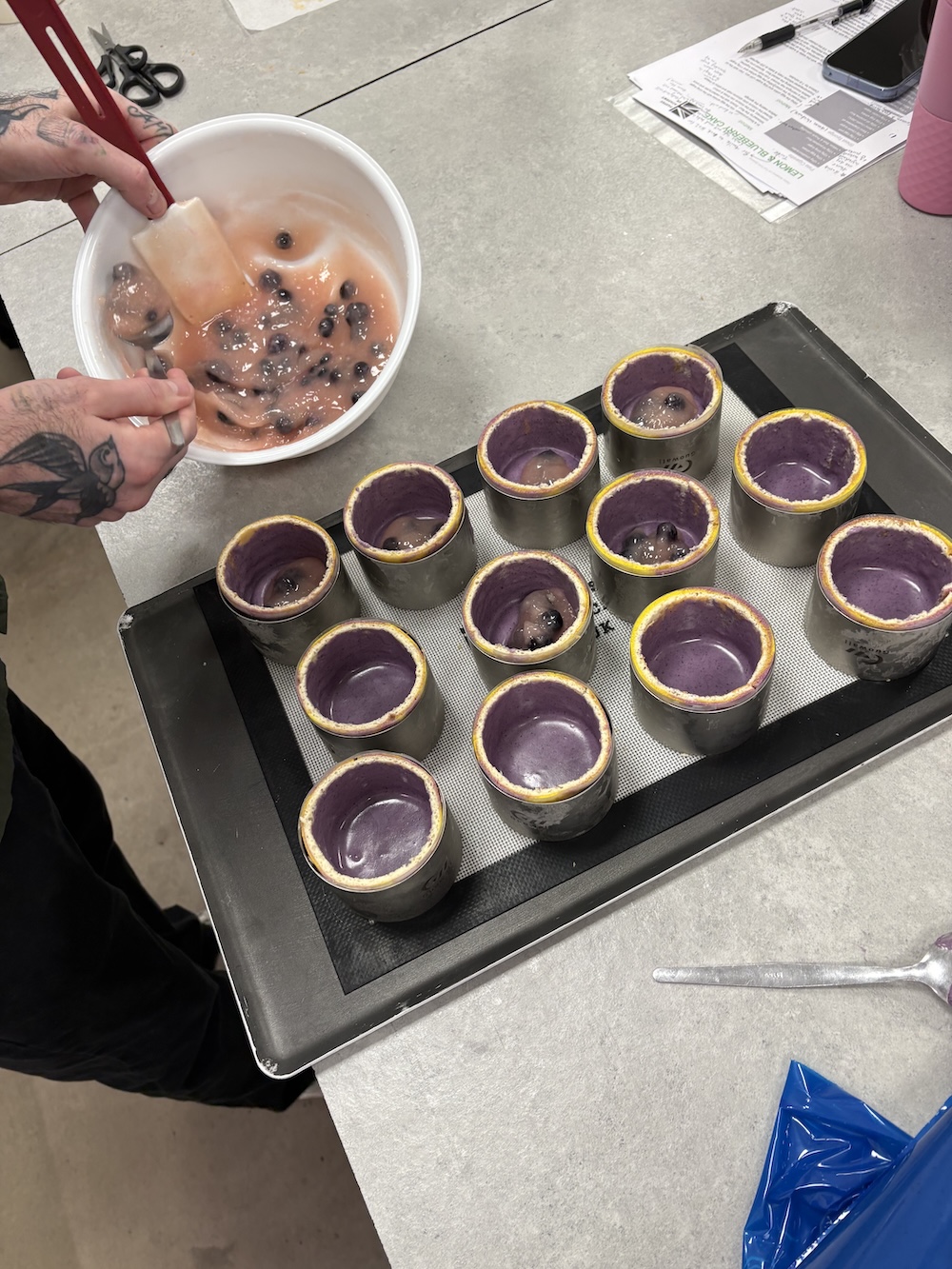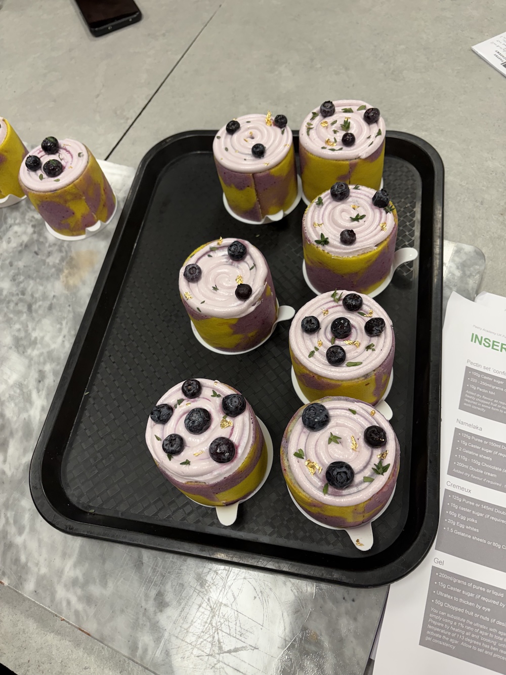 Welcome to week three of pastry school, today we created a lemon blueberry petite gateaux. We started the day by creating a twill batter to create a swirled color design on the outside. Since the flavor was lemon blueberry we used purple and yellow to create the design, we did not use blue as where it would mix with yellow it would create a green color that we did not want.