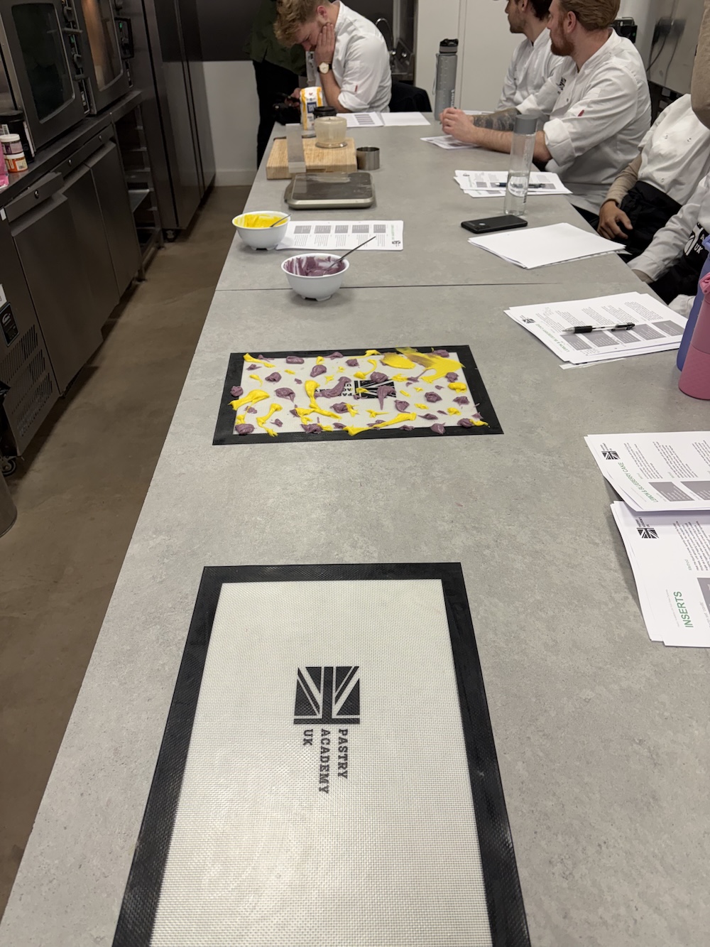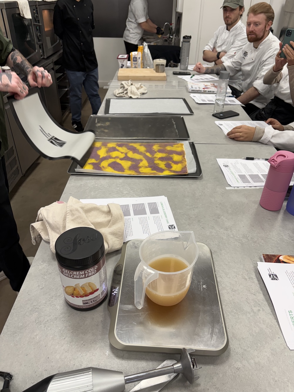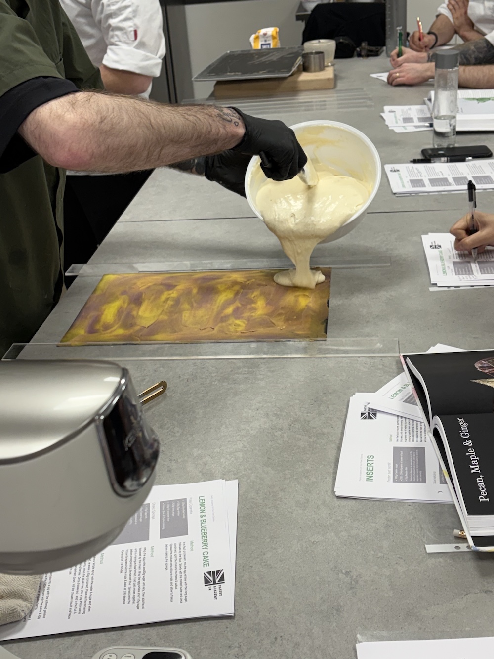 Welcome to week three of pastry school, today we created a lemon blueberry petite gateaux. We started the day by creating a twill batter to create a swirled color design on the outside. Since the flavor was lemon blueberry we used purple and yellow to create the design, we did not use blue as where it would mix with yellow it would create a green color that we did not want.