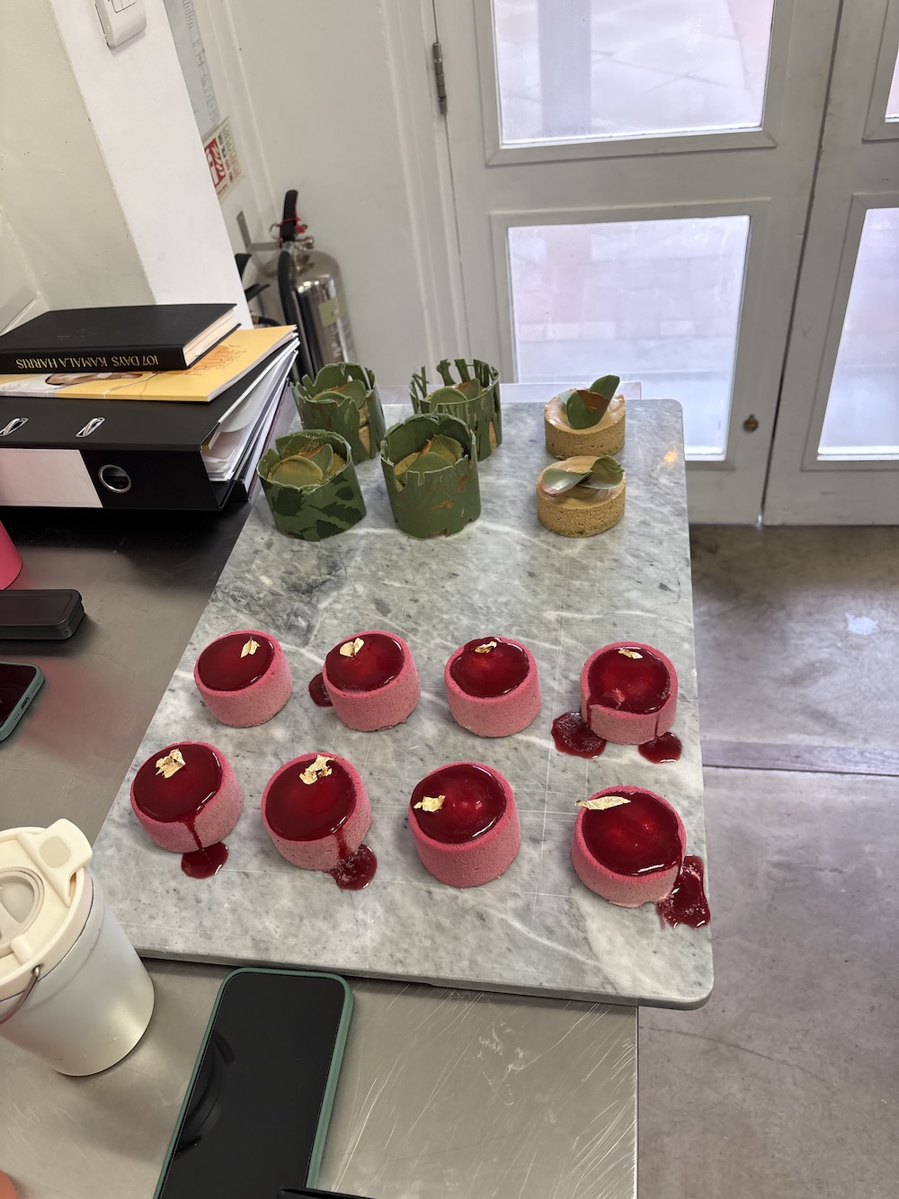 I think that this was my least favorite lesson so far due to the large amounts of soft jelly and mousse consistency’s, as well as the inconsistency’s of molds leveling. Of course with that I hope to try to make them in my own flavors once I get home to try the techniques and get better at petite gateaux’s. Tomorrow we move on to entremets which are similar to petite gateaux’s but have a lot more layers.