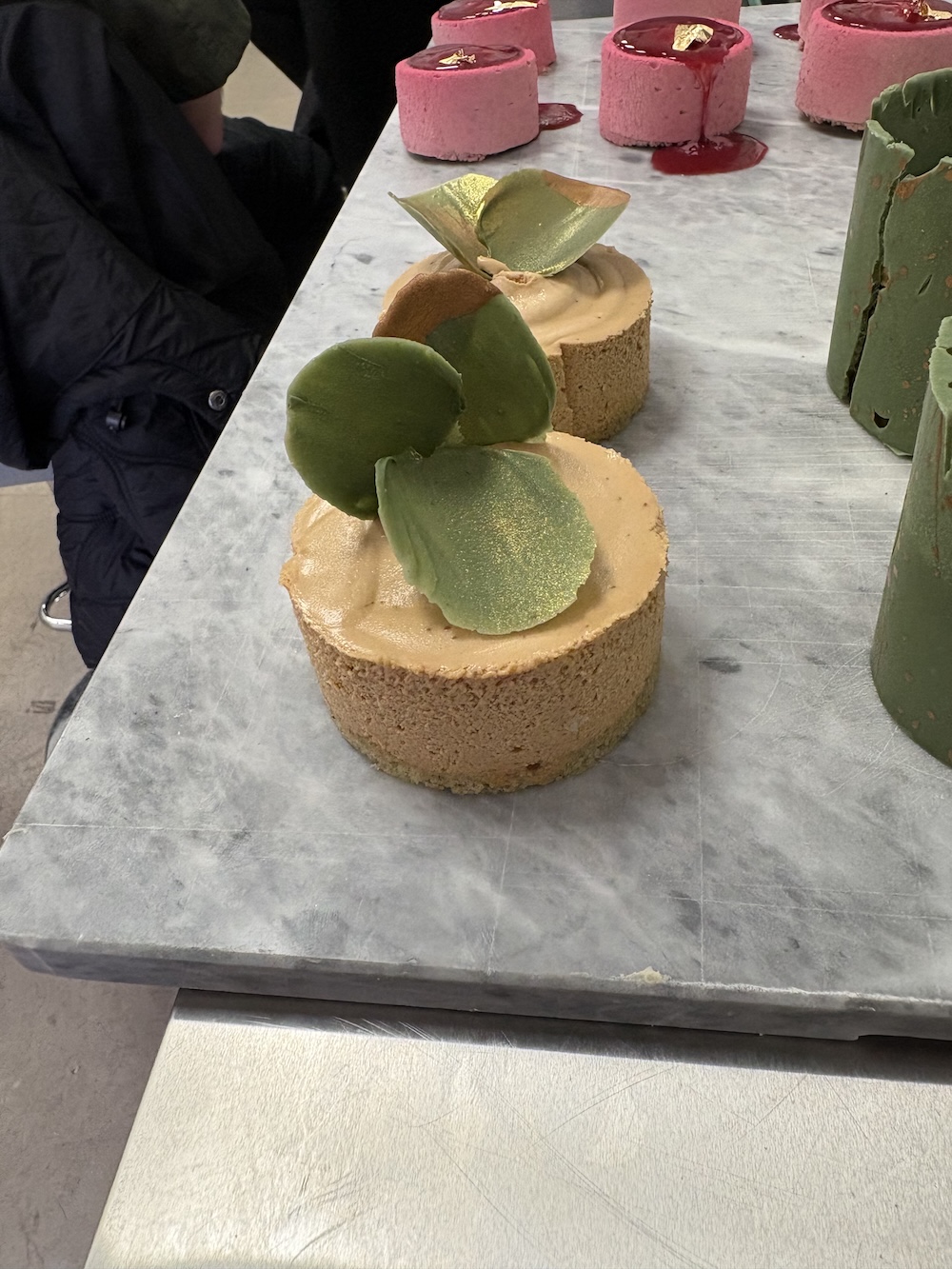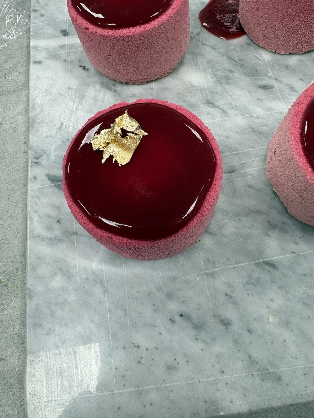 Today marks the halfway point of this 5 week diploma class, very sad to know I only really have two weeks left before its back to real life. We spent the day finishing the mini cakes with multiple different techniques such as mirror glaze, cocoa butter spray, and chocolate work. The two cakes that my team finished had a few issues as the chocolate work did not set as planned and the raspberry gel on top did not consistently work as the cake was not as flat as we would like. Sometimes things don’t always work out but thats why we take the class and learn for next time.