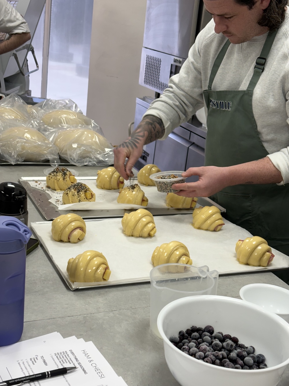 Jamie had made some ham and cheese croissants that were placed in the proofer before we arrived this morning. He egg washed the croissants and sprinkled with everything bagel seasoning. These were then baked and then eaten quickly as they were too delicious not too.