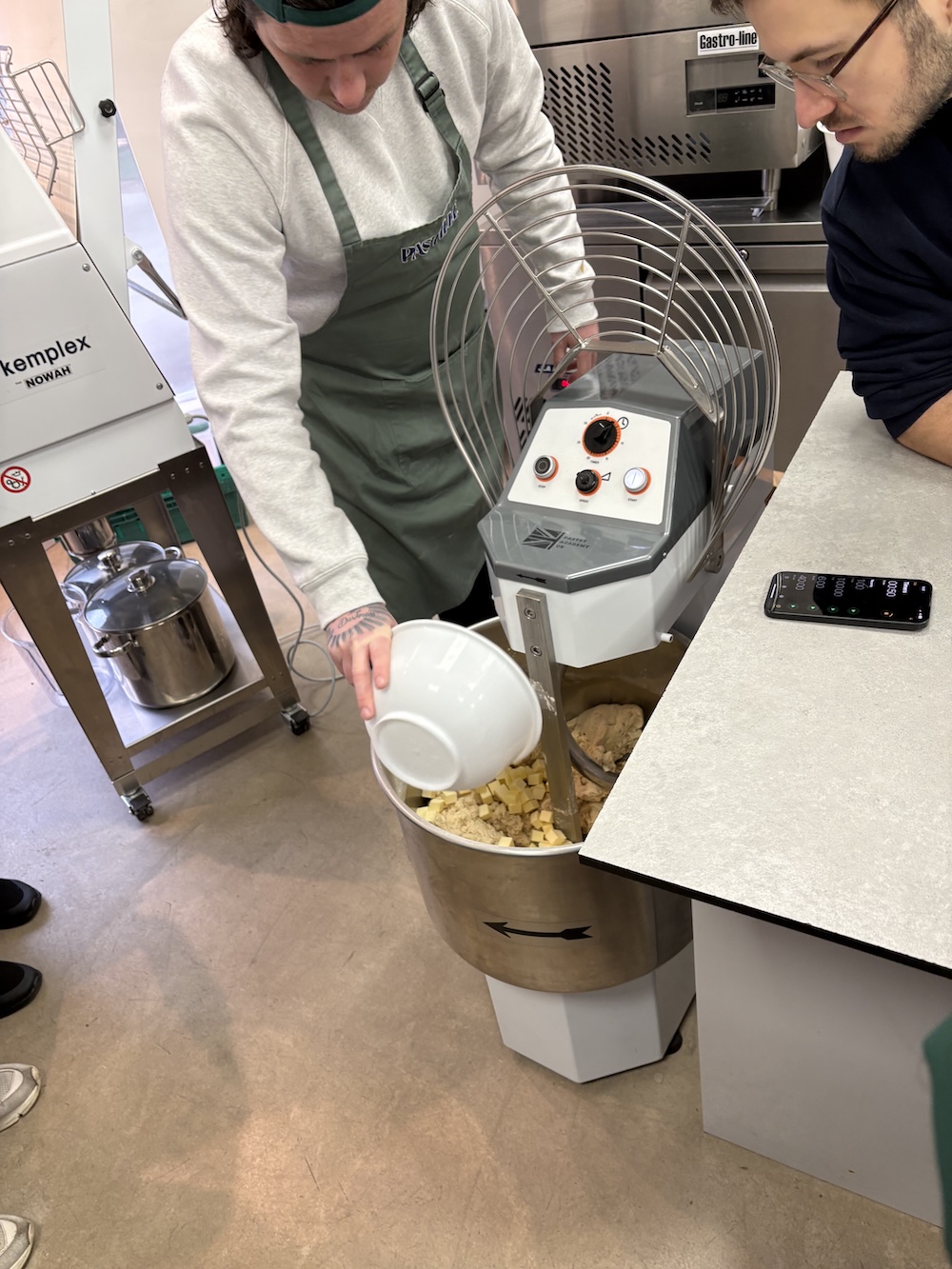 With some of the leftover dough we made brioche buns to show how to use the excess waste. Jamie combined dough, sugar, salt, flour, and eggs in a mixer to make a brioche dough. This was then balled into 3g balls and placed in rings, this will also be proofed and baked tomorrow.