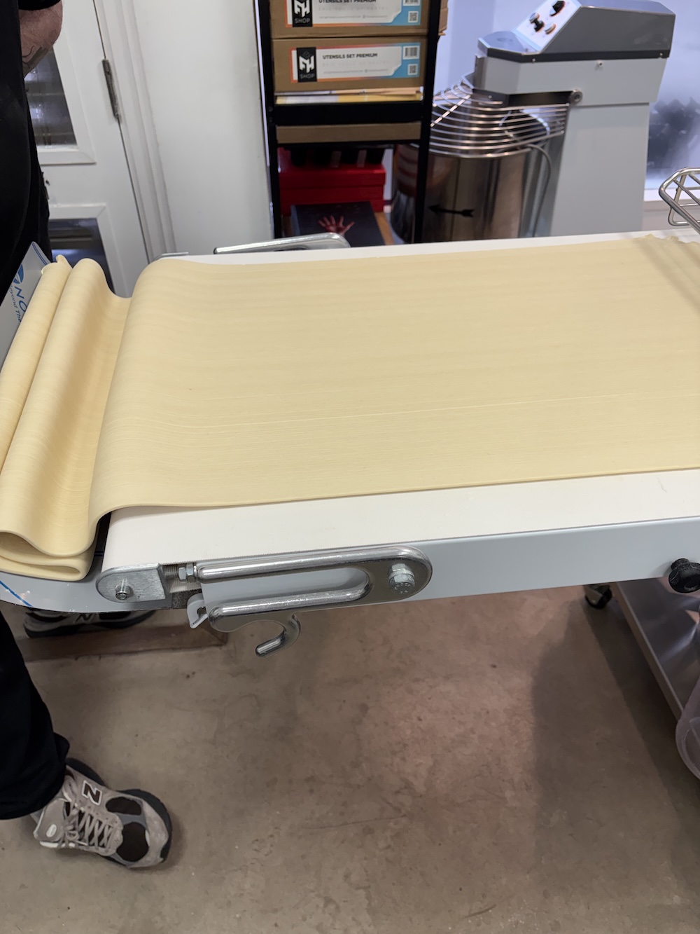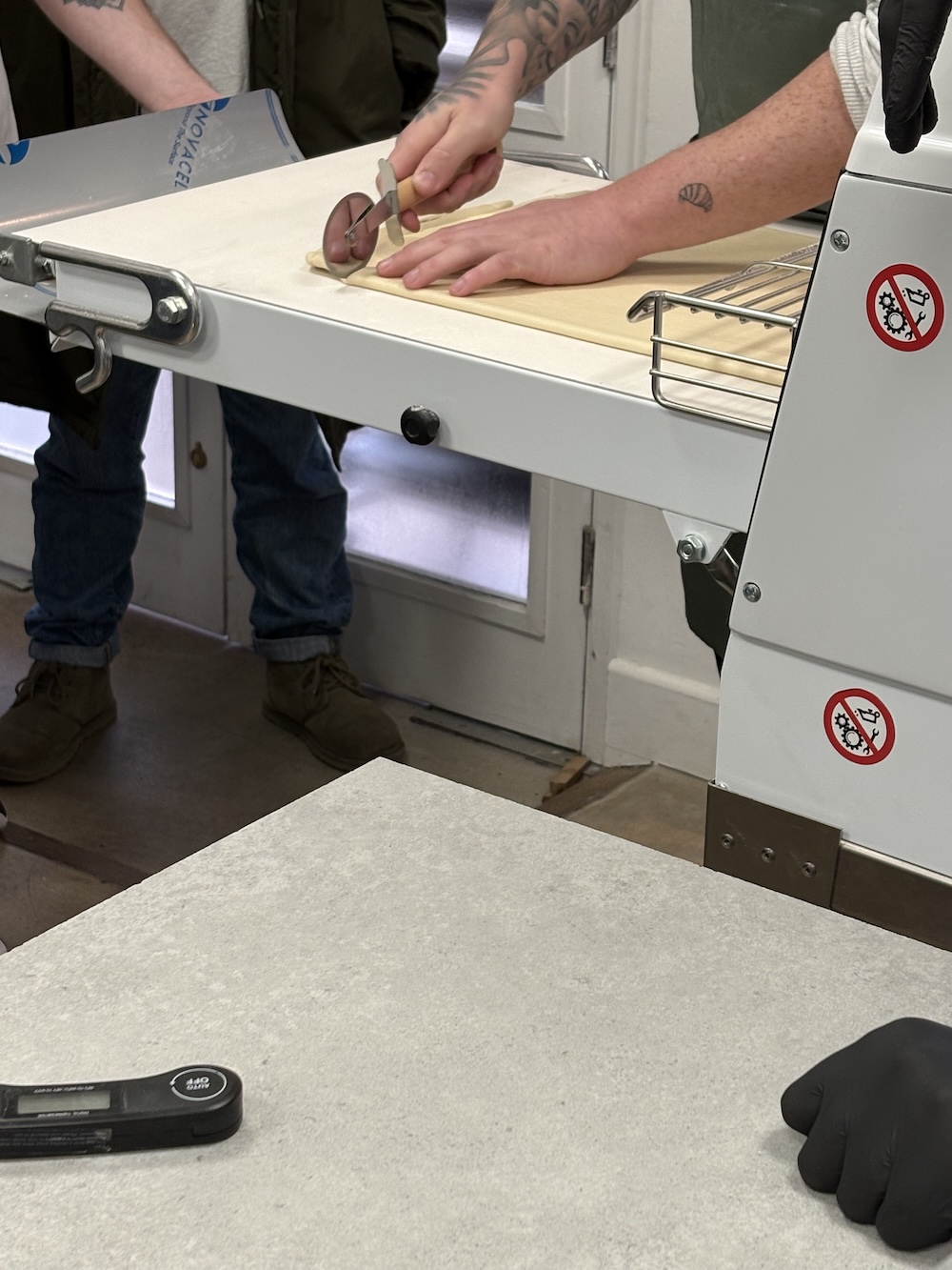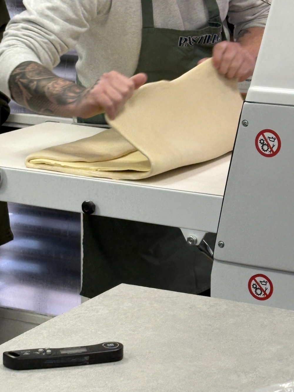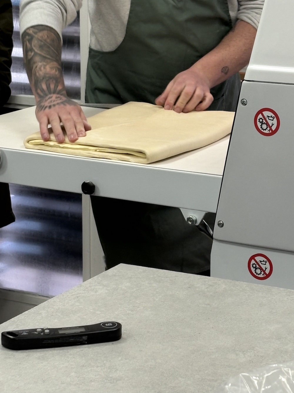 Jamie split the 4.25 kilos of dough into four large balls and one small ball that will be used as a topper. While the dough rested on the counter for an hour we used the sheeter to laminate the butter and get it 6mm in height all around. The butter was then put in the refrigerator to chill to 9 degrees celsius.