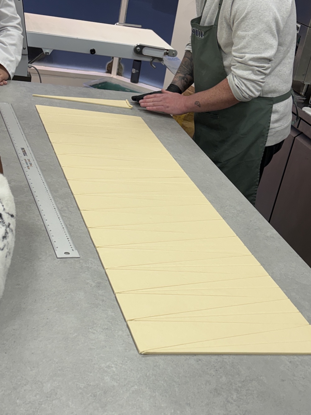 After the dough had set on the counter for an hour and in the fridge for about 4 hours, we started on lamination. Jamie does a double fold lamination for all of his pastries to get the flakiest dough, this take two full book folds. Once the dough was big enough to hold the laminated butter the butter was placed in the dough and folded in. When using the laminator we started at 15mm and worked our way down to 6mm in 2mm increments. This takes a lot of practice and memorization but with some youtube videos and pictures anyone can you a lamination machine.