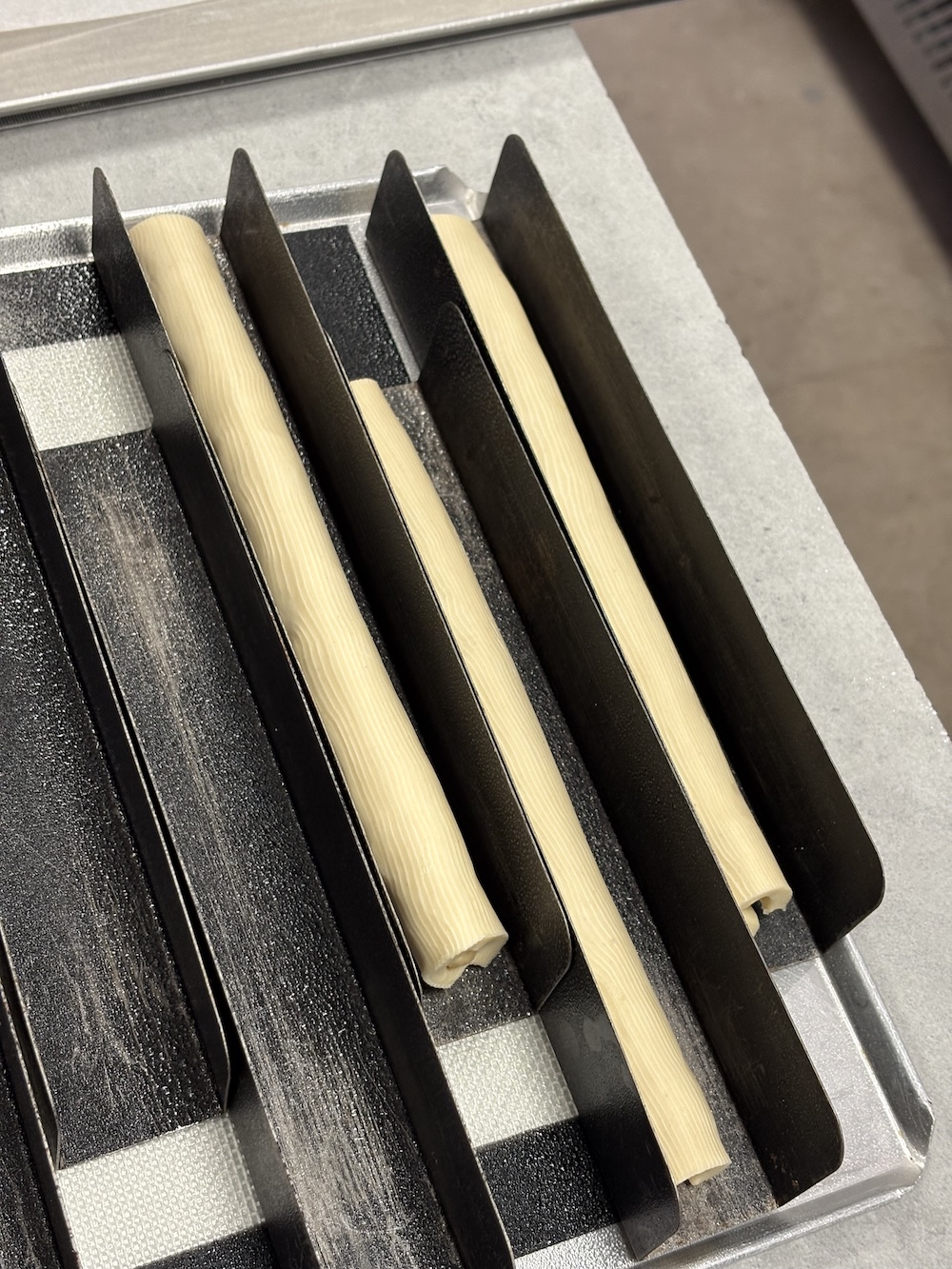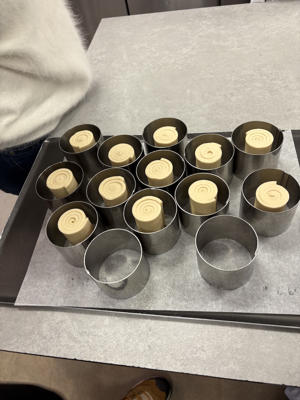 Next we moved onto the rest of the viennoiserie by cutting out the danish’s, rolling the pain au chocolate’s and croissants, and rolling the cruffins. The cruffins are baked in metal rings vertically to create that muffin affect out of croissant dough. All of the pastries were placed on parchment lined sheets and put in the freezer. These will all be placed in the proofer tonight and the proofing process will be started around midnight using a timer. Tomorrow Jamie will explain the entire proofing process and we will bake all the croissants.