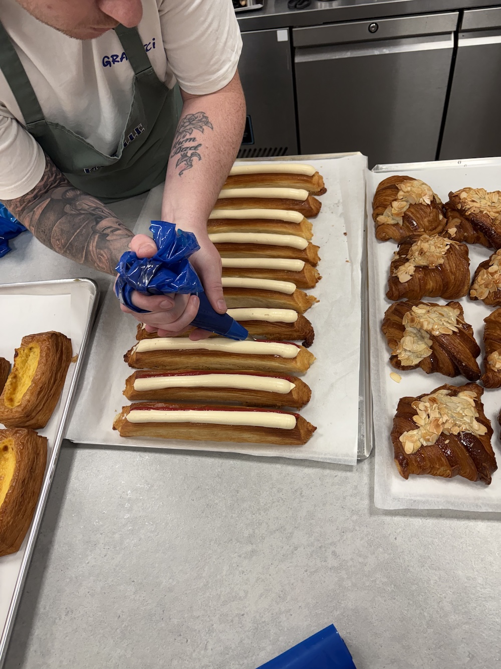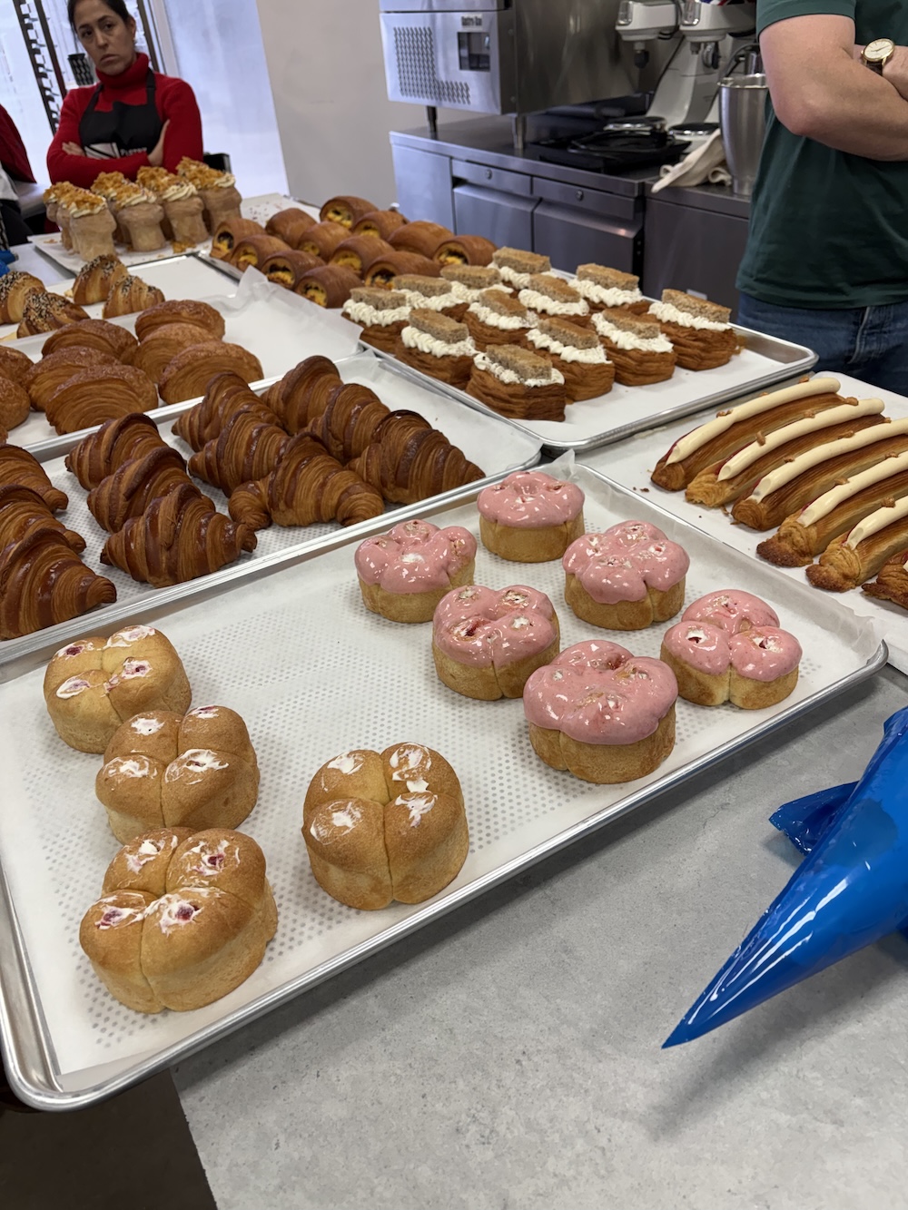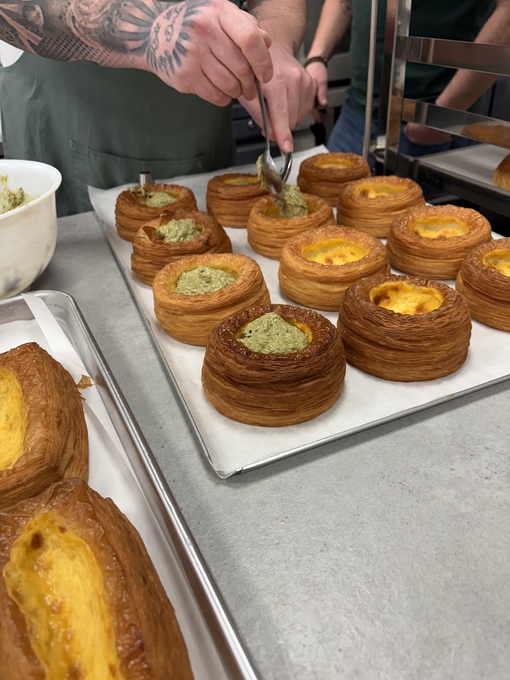 We started by preheating the ovens and pulling out the croissants to egg wash. All of the pastries got an egg wash except the cross laminated dough and the brioche. A spray gun was used to make sure the egg wash was even but also it is helpful when mass producing pastries. When egg washing you want to avoid getting egg wash on the lamination/butter sections as it will mess with the visual affect. That is why the cross laminated dough does not get an egg wash, the brioche just doesn’t need it. For the danishes we only egg washed the tops of the pastries and then Jamie pushed the centers down to add pastry cream inside before they were baked.