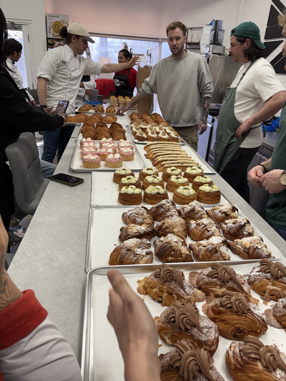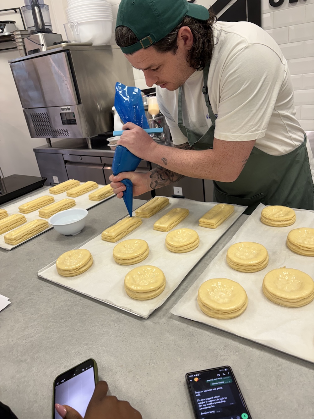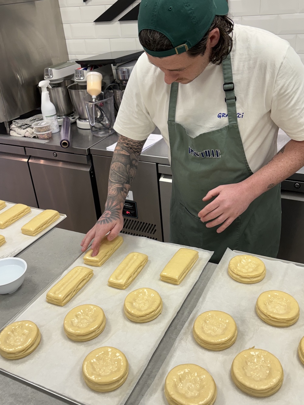 We started by preheating the ovens and pulling out the croissants to egg wash. All of the pastries got an egg wash except the cross laminated dough and the brioche. A spray gun was used to make sure the egg wash was even but also it is helpful when mass producing pastries. When egg washing you want to avoid getting egg wash on the lamination/butter sections as it will mess with the visual affect. That is why the cross laminated dough does not get an egg wash, the brioche just doesn’t need it. For the danishes we only egg washed the tops of the pastries and then Jamie pushed the centers down to add pastry cream inside before they were baked.