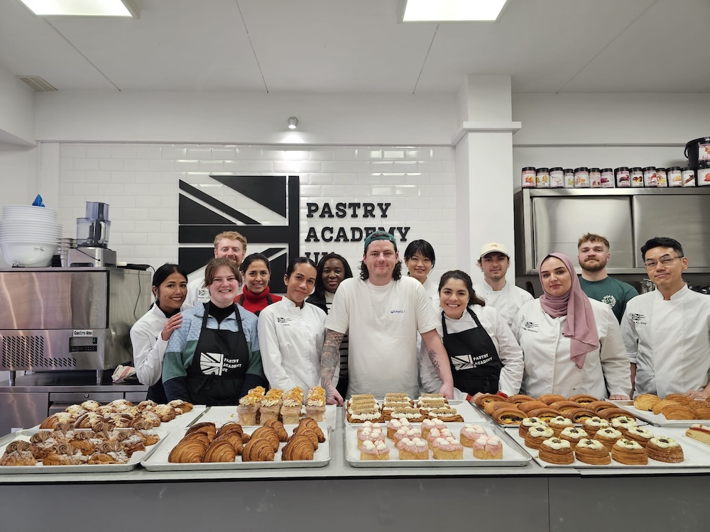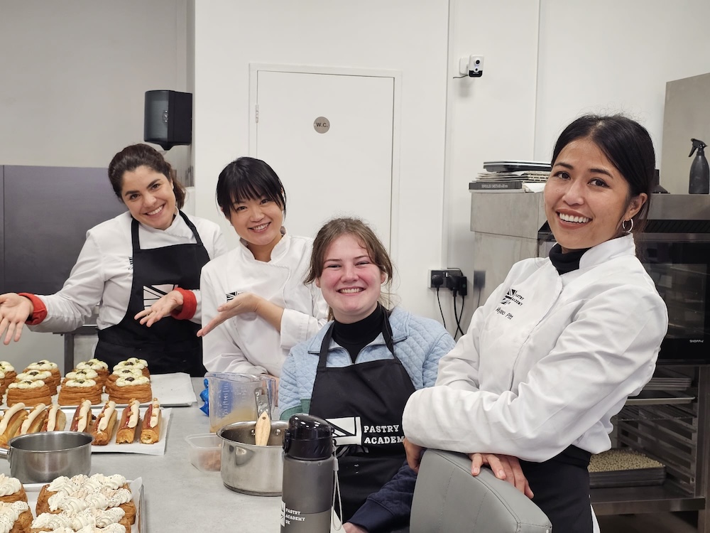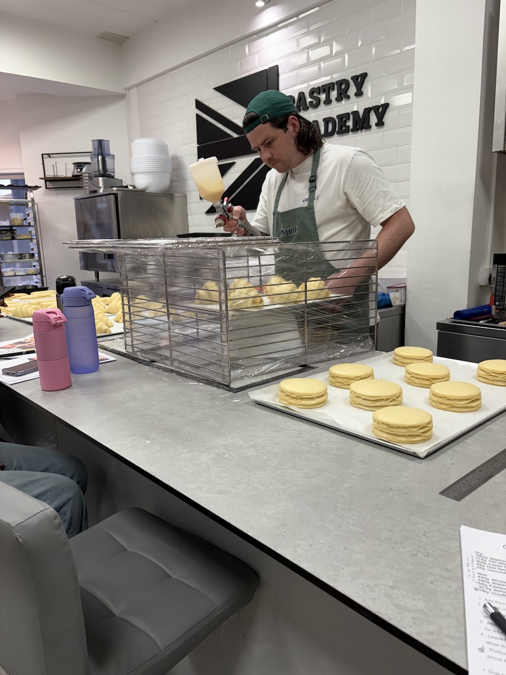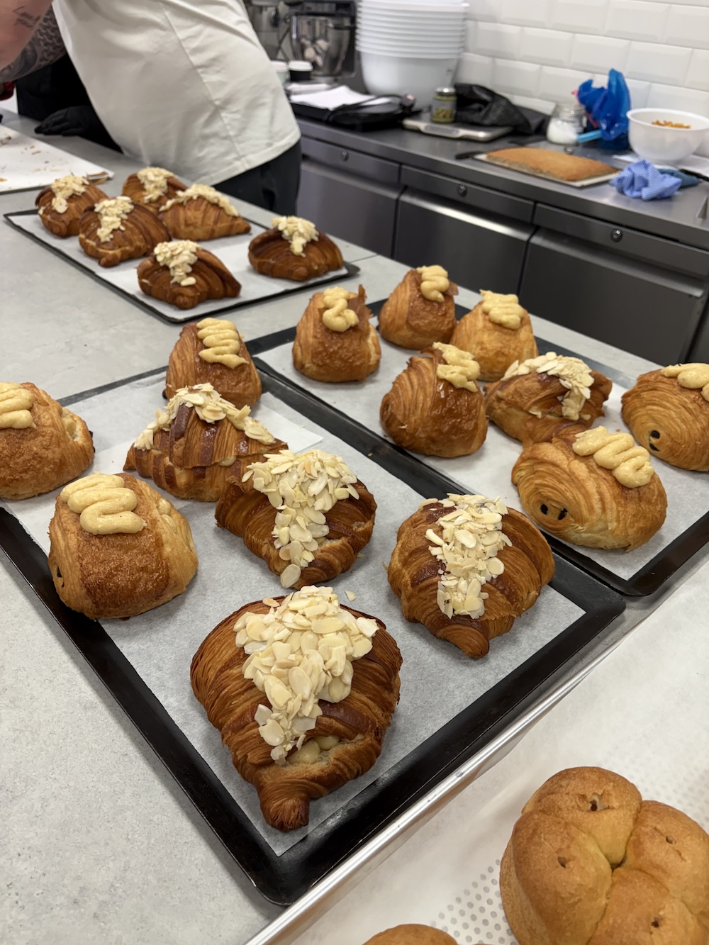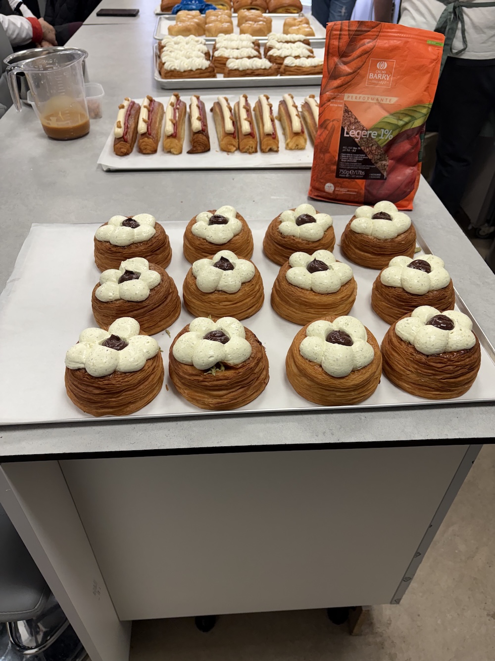 While the viennoiserie was baking, we worked on the whipped ganaches and other toppings/fillings. A lot of the filling recipes were very similar to the whipped ganache recipes we have used in the past few weeks. The kitchen was filled with croissants coming in and out of ovens, mixers on high, and induction stoves heating off and on. All of the pastries were pulled out of the ovens to cool before being filled and topped. The croissants were split into plain croissants and then the other half were made into almond croissants by filling them with the frangipane from yesterday and baking again. Half of the pain au chocolat’s were made into the hazelnut pain au chocolat’s the same way.