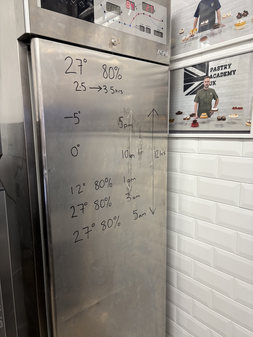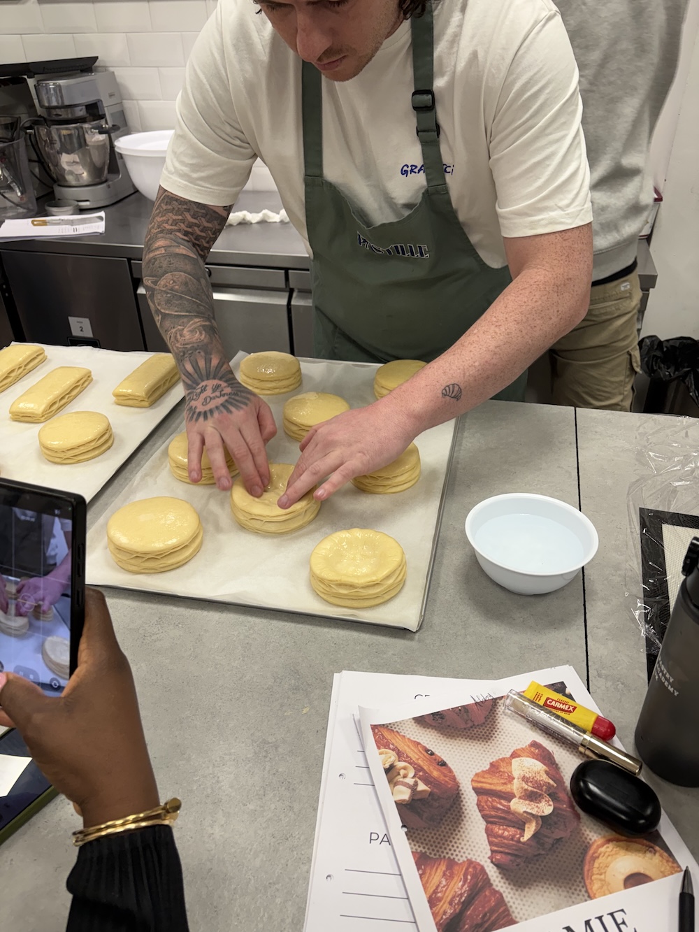 Another day, another croissant! Today we finished Jamie’s class by completing all ten of the delicious laminated pastries. When we arrived to class this morning the pastries were in the proofer at 27 degrees celsius and 80 percent humidity. These had been started yesterday at 5pm and had been placed on a specific schedule to be ready to bake by 10am today.