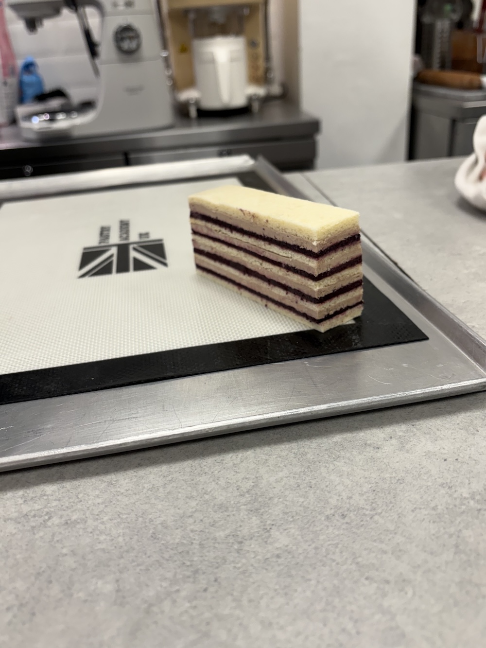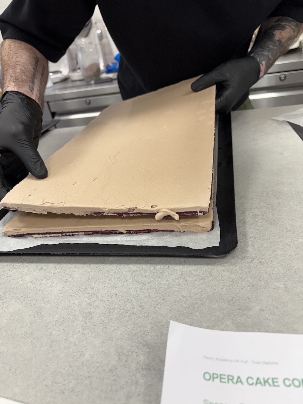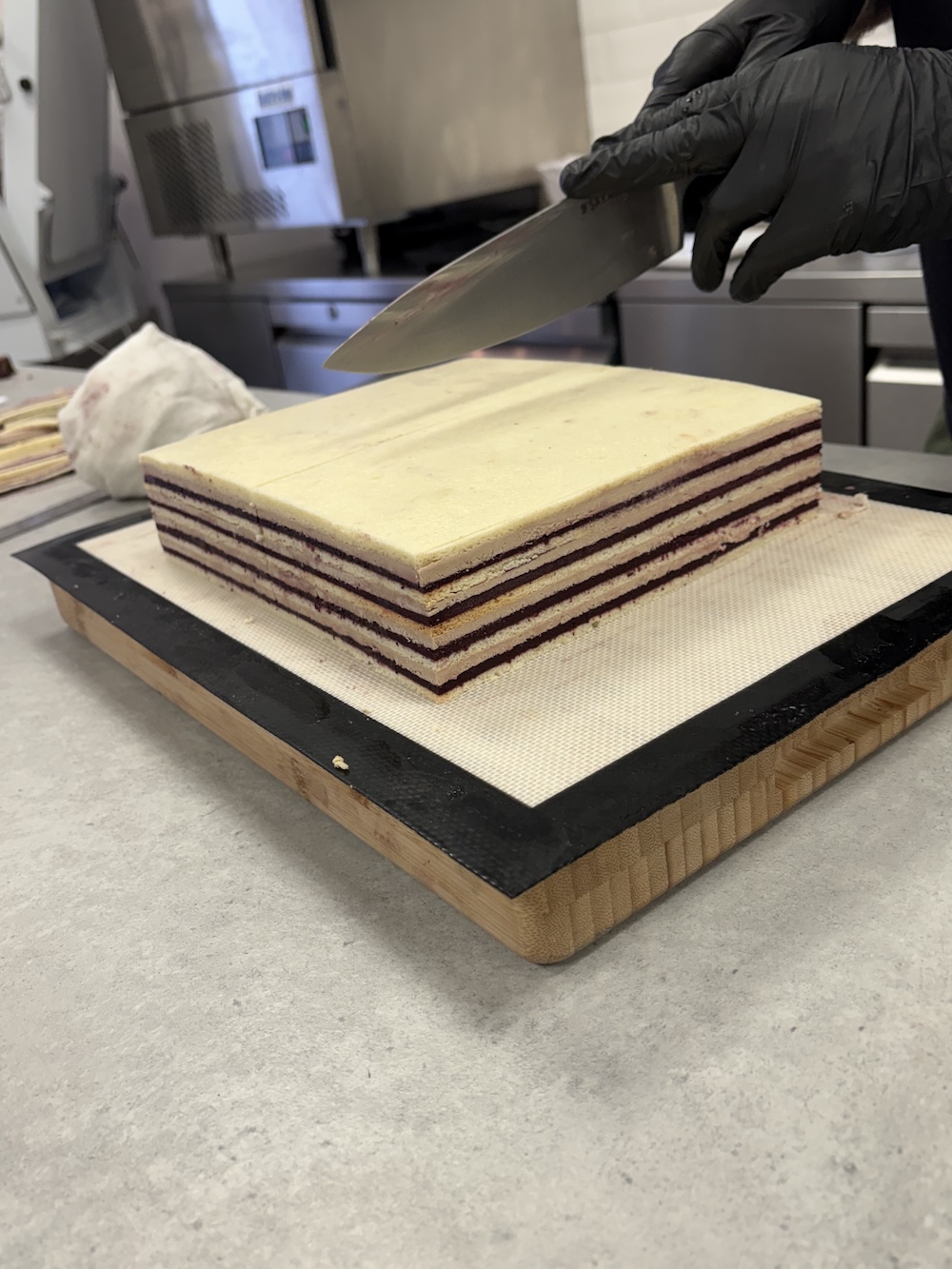 The best way to layer the opera cake and to get the layers even was to use acrylic slats to smooth each of the components evenly. After one layer of each component we repeated on a separate sponge and then froze both in the blast chiller to set before layering them on top of each other. We then cut this 6 layer cake in half to layer on top of each other and create even more layers. Finally we added the sponge on top and cut all of the edges to make them uniform.