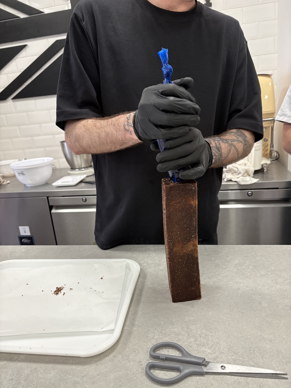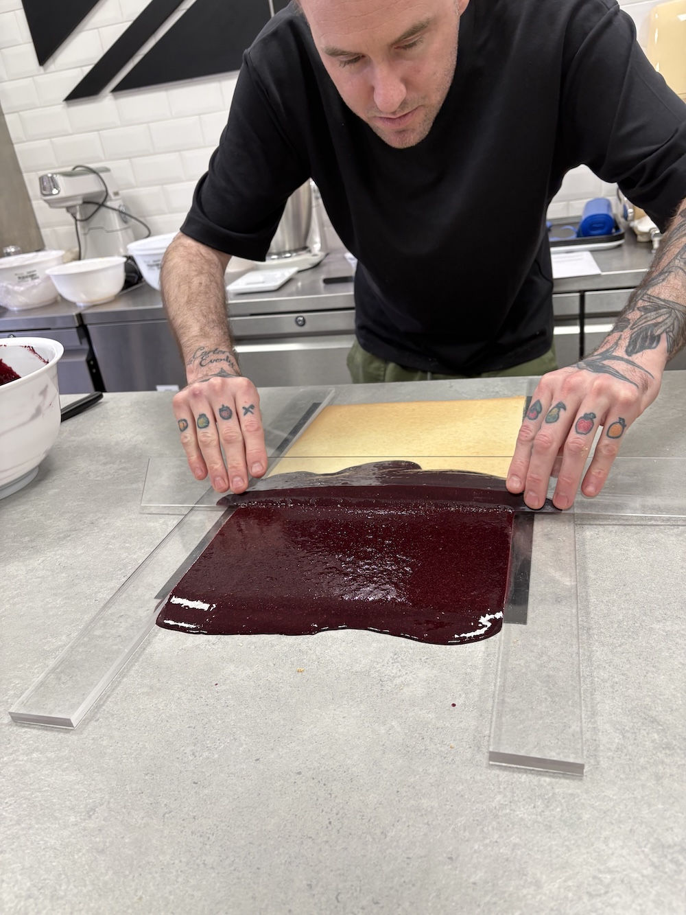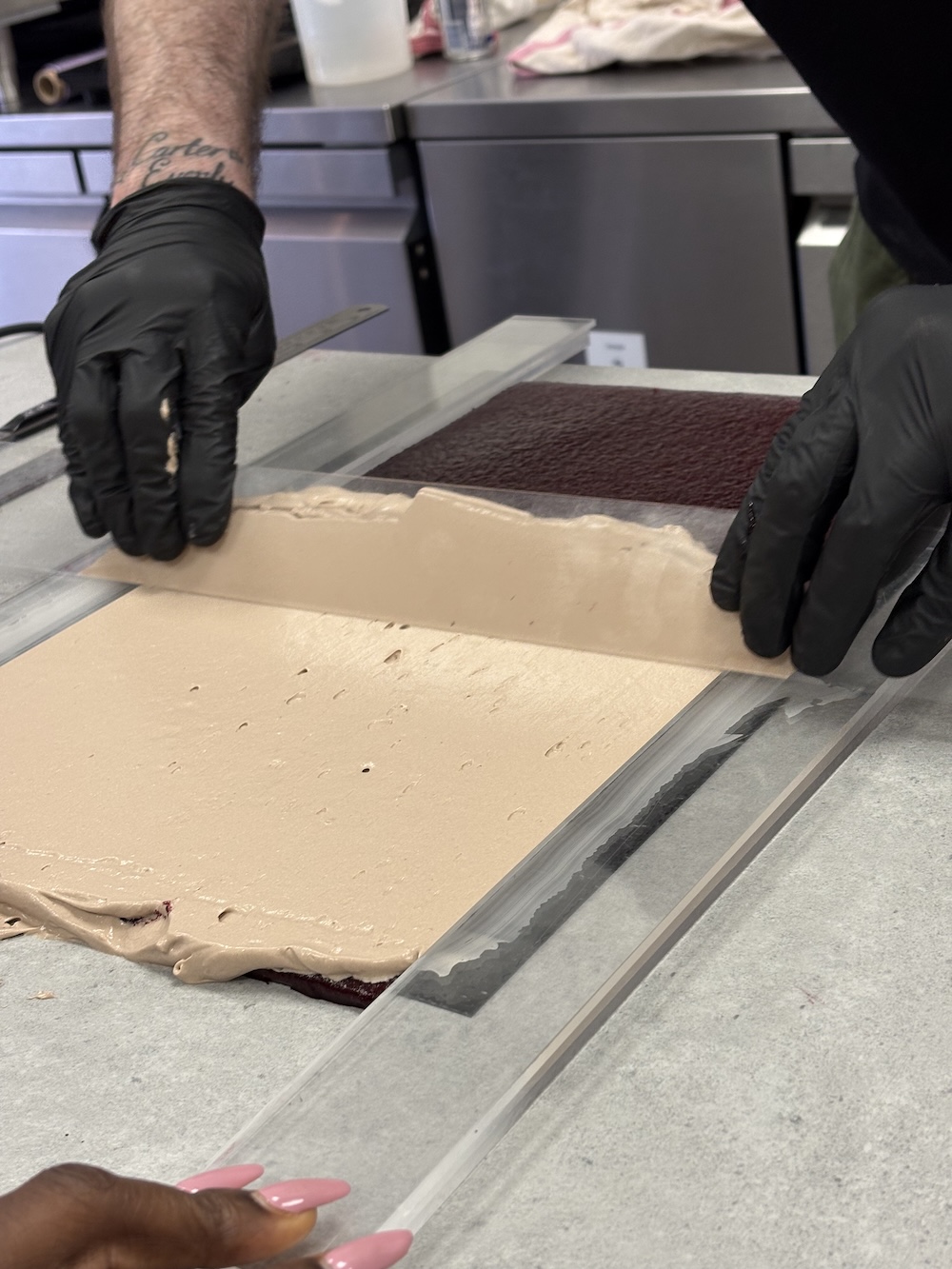 The best way to layer the opera cake and to get the layers even was to use acrylic slats to smooth each of the components evenly. After one layer of each component we repeated on a separate sponge and then froze both in the blast chiller to set before layering them on top of each other. We then cut this 6 layer cake in half to layer on top of each other and create even more layers. Finally we added the sponge on top and cut all of the edges to make them uniform.