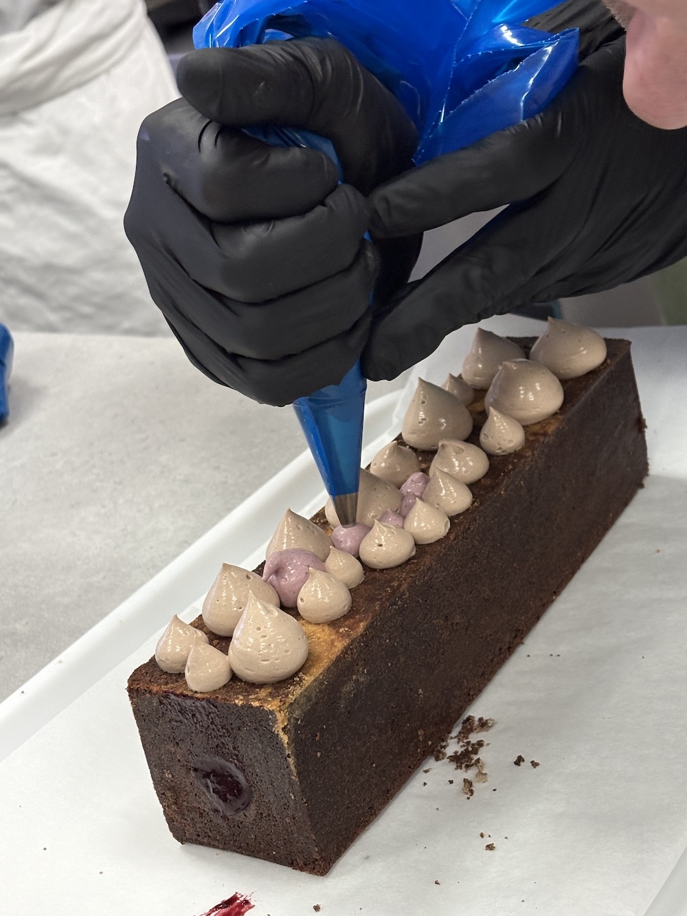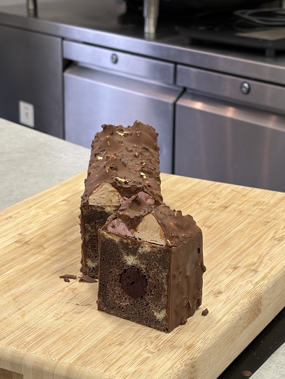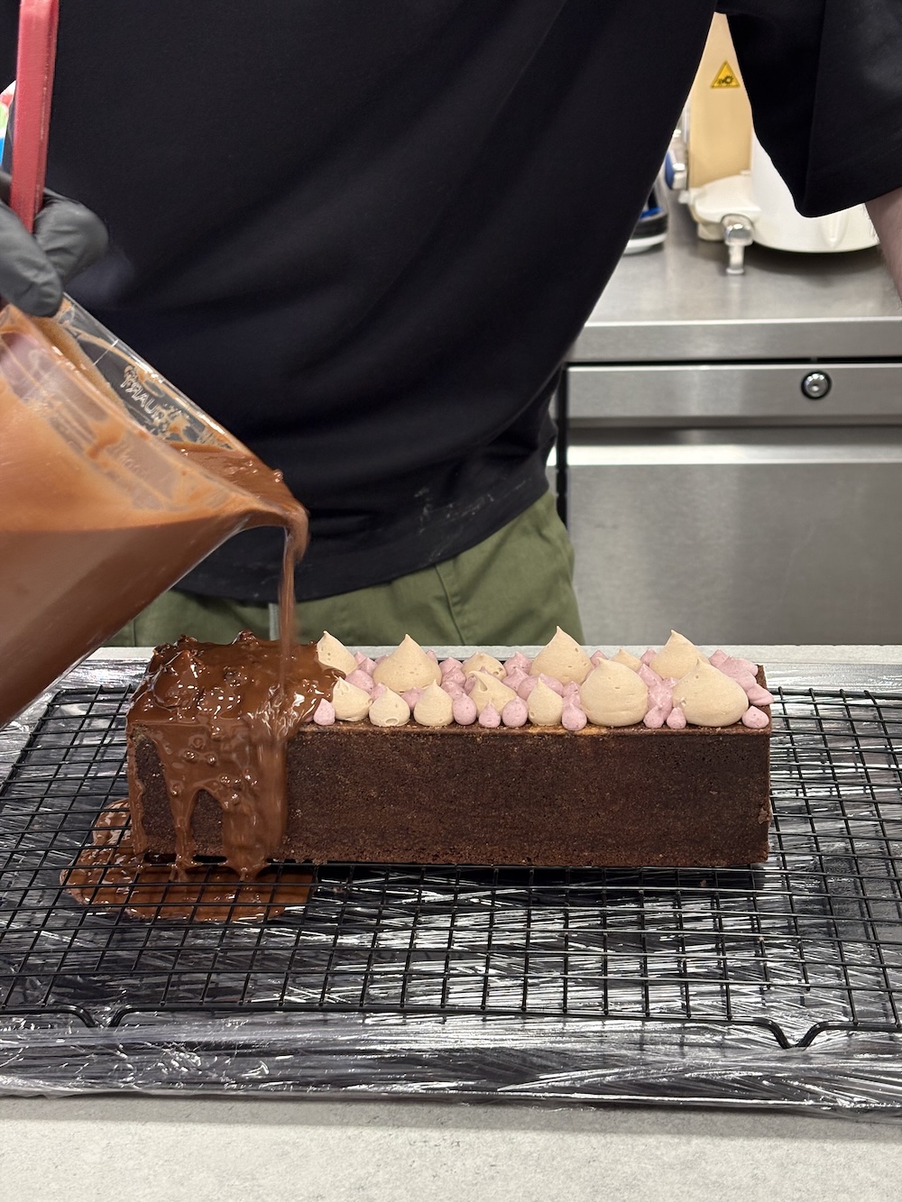Once the cake was completely cooled we slid it out of the metal mold and then filled it with the cherry jelly. We then threw it into the blast chiller and made a chocolate diplomat cream and a cherry whipped ganache to decorate the top. This was piped on top of the cake and then we used a mixture of chocolate, oil, and cocoa nibs to enrobe the entire cake. Once sliced in the cake shows the cherry jelly insert and the two different creams on top. Since the cake was cooked in a closed environment it became very dense however it still tasted scrumptious.