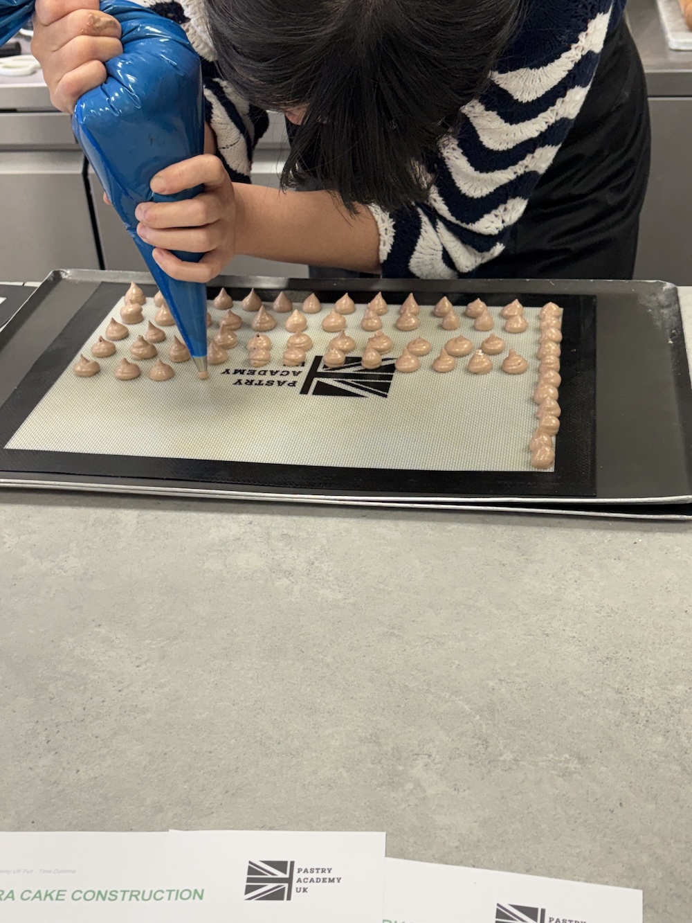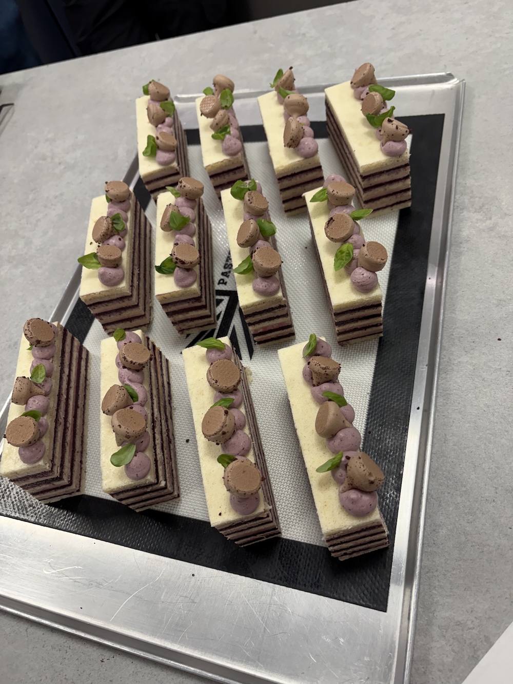 We topped the opera cake with the whipped cherry ganache and some chocolate meringues that were also made. The opera cakes ended up looking very uniform and pretty and would be perfect to serve at a party. Tomorrow we work on petite fours and then we are pretty much done with the course. Last week best week!