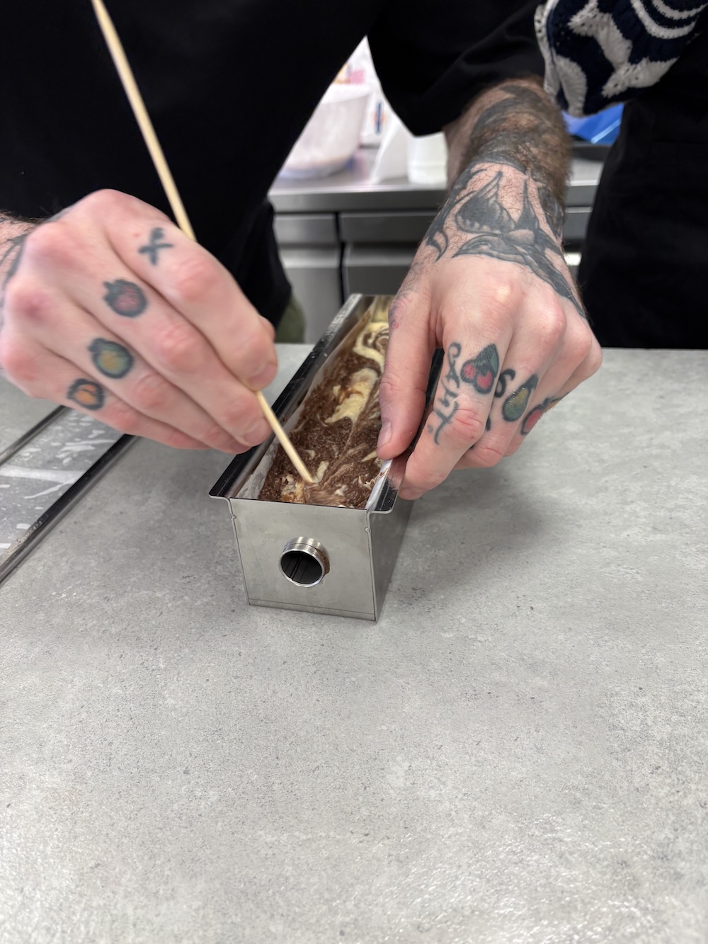 We started with the travel cake which consisted of a marbled vanilla cocoa cake and a cherry jelly filling. The cake was baked in a closed metal box environment with a hollowed tube insert to create a hole for the jelly to sit in. When the cake was finished baking we took the top off to let the heat out and then we removed the tube when it was slightly cooled but not compleltely cooled. The tube needs to be removed before the cake completely cools so that it does not dry to the tube and then it is not removable.