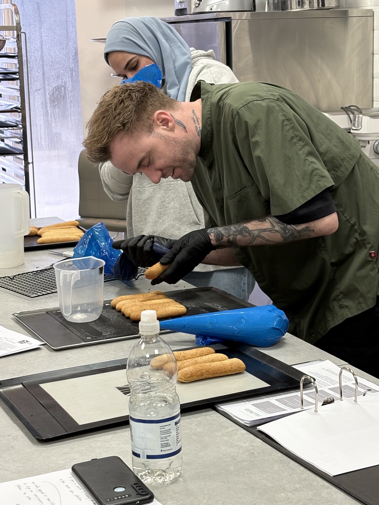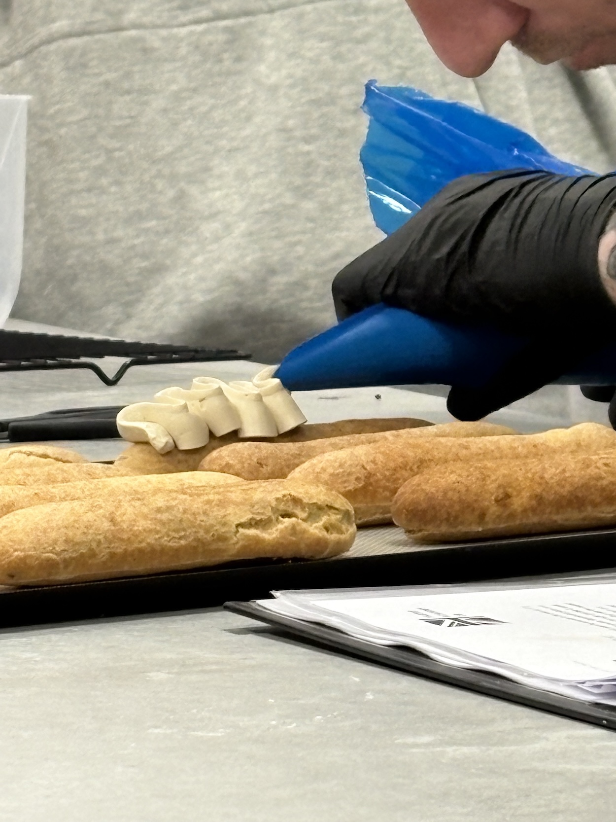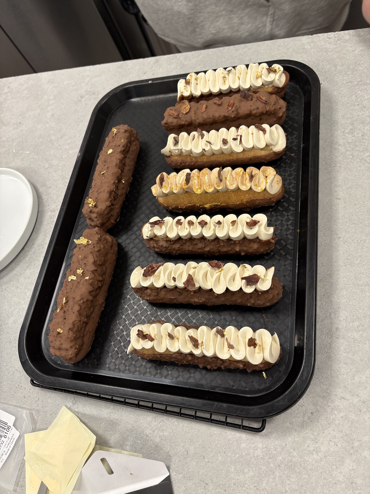 The last day of the first week is bittersweet, I cannot belive its already Friday! Today was a short day, we worked on finishing all of our eclairs and cream puffs from yesterday. We started by making some ganache, whipped ganache, and chocolate cocoa nib dip. Damien showed us how to fill the eclairs and then dip them in the chocolate sauce to cover up blemishes on the uglier eclairs.